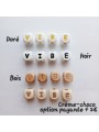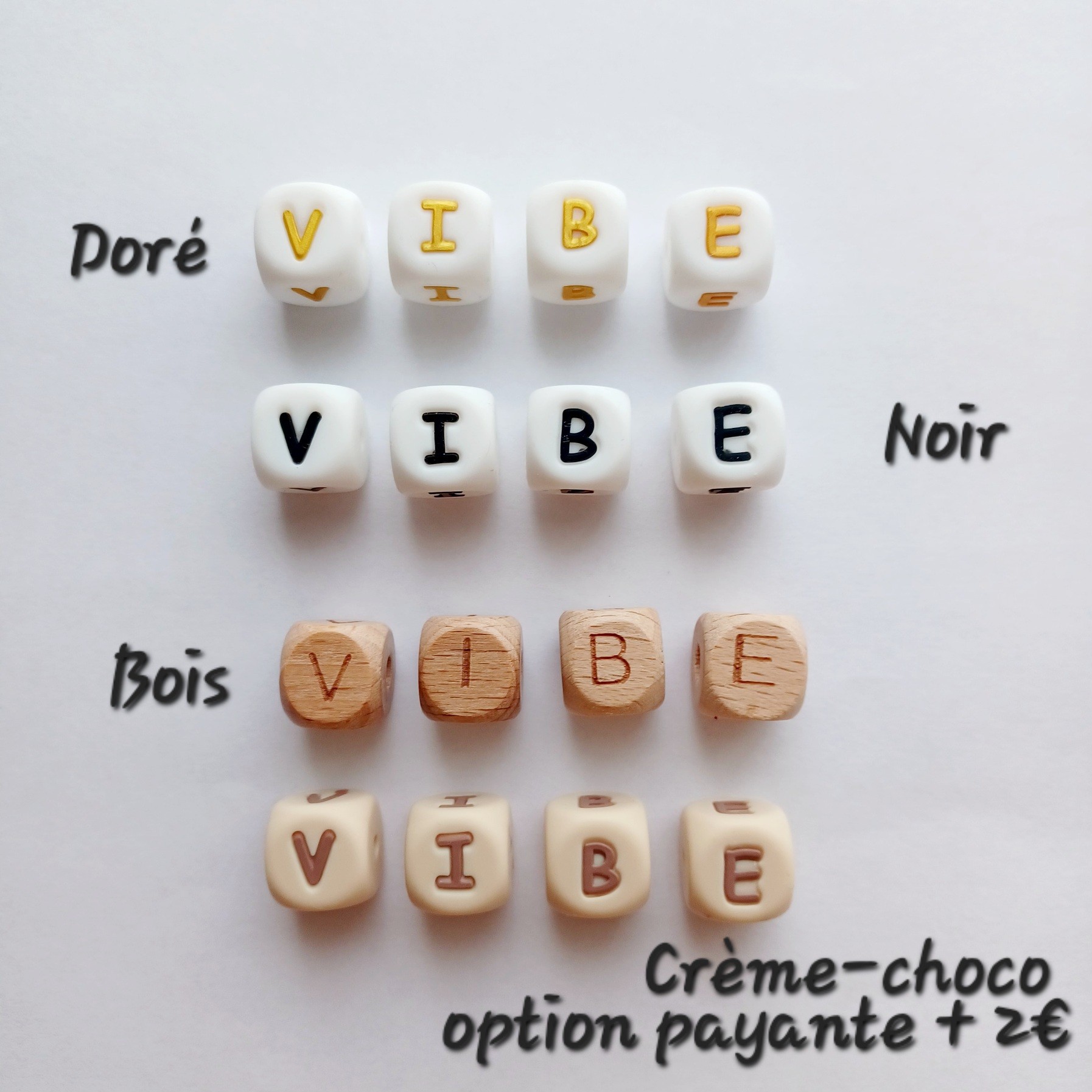-- : Lettres du prénom en bois ou en silicone (merci de me contacter) voir photo avec les choix disponibles.