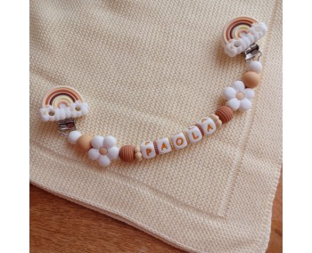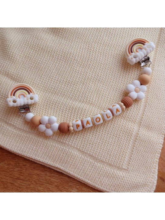 Attache doudou personnalisée en silicone, arc en ciel, beige crème marron, prénom enfant.