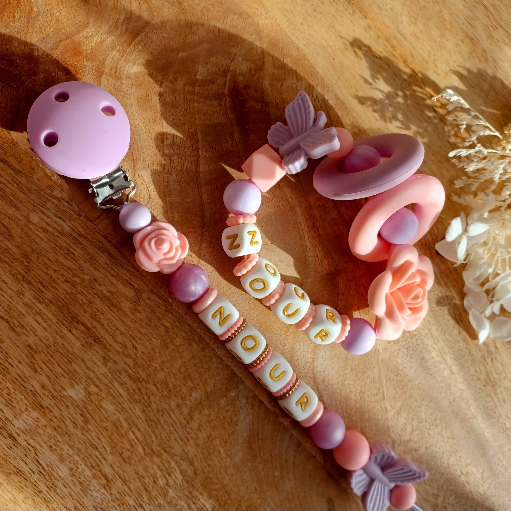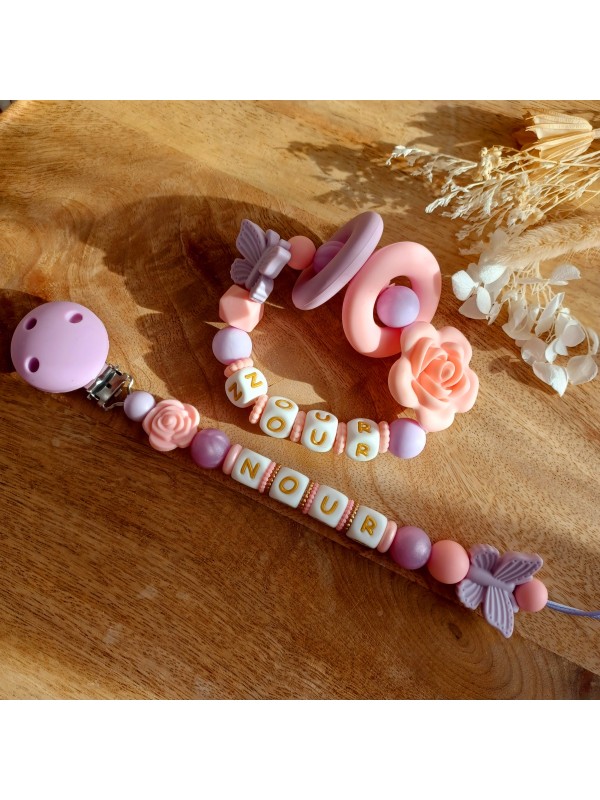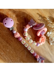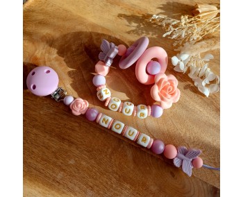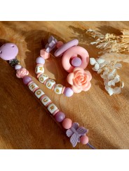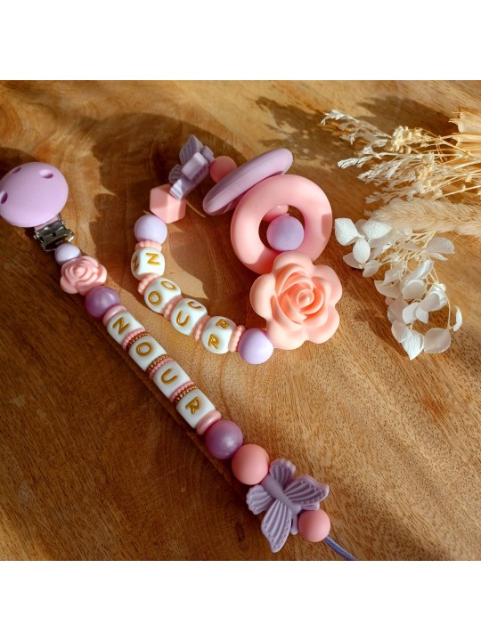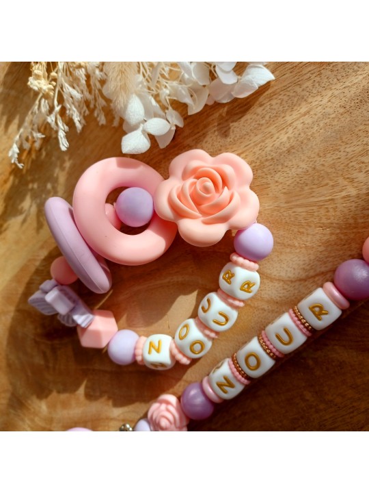 Attache tétine personnalisée en silicone Rose et Lavande