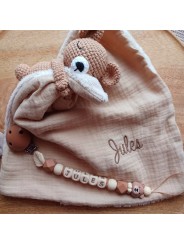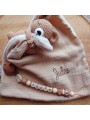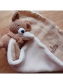 Le lange à un coté double gaze coton et l'autre coté un minky tout doux. Taille env. 28*28cms. Vous pouvez retirer le lange pour faciliter le lavage. 100% fait main.