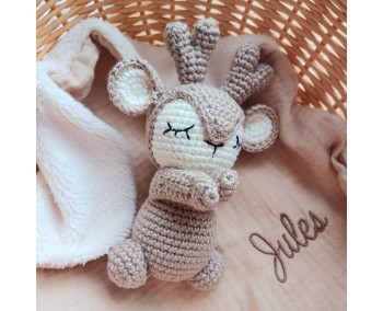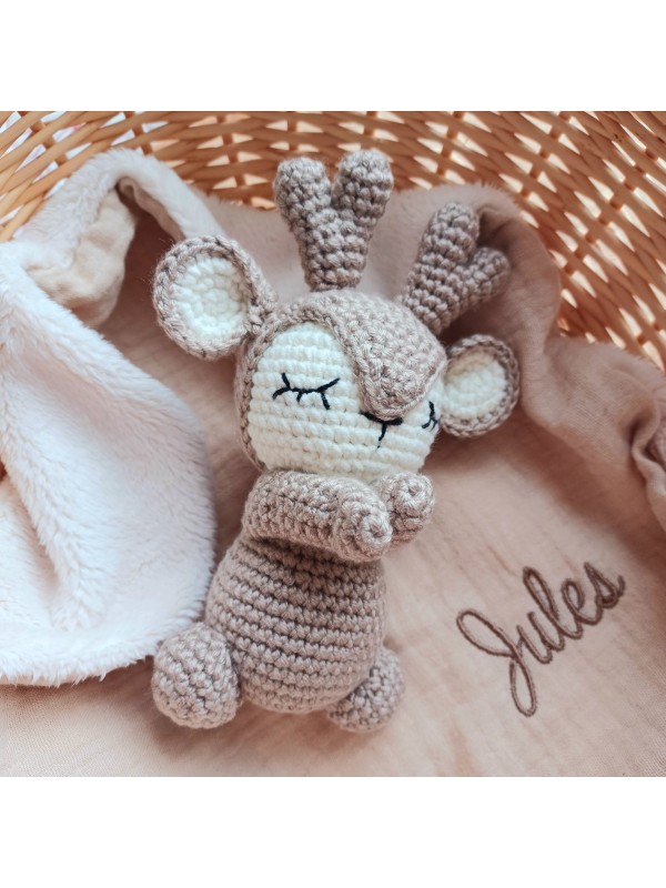Doudou Biche en tricot, avec lange gaze de coton,Cadeau de naissance.
