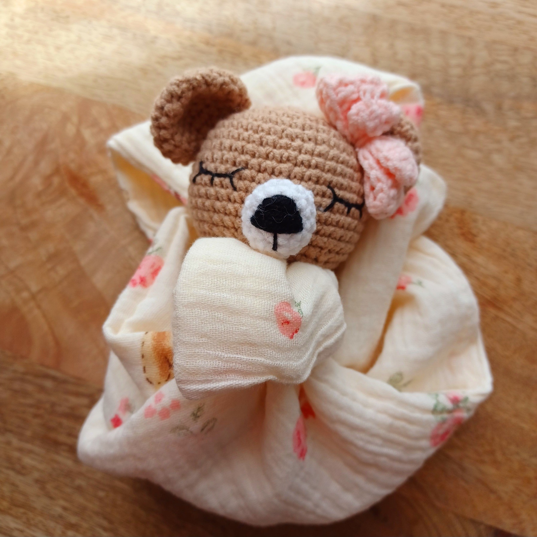 Tête et détails crochetés à la main en coton certifié OEKO‑TEX, respectueux de la peau fragile des tout‑petits.